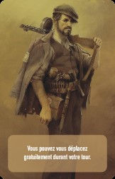 Une carte d'un résistant que vous pourrez recruter. Sa biographie sera présente dans le journal historique. Les deux carrés représentent sa spécialité. Il peut faire des faux papiers et remplir cette mission pour deux spécificités éventuellement demandées sur une mission. Le petit icône en bas à droite (tête de mort et loupe) avec le numéro spécifique correspond au scénario joué. Ainsi, le classement est simple et, comme certaine carte peuvent être rejoué de scénario en scénario, ce numéro sera présent sur la règle.